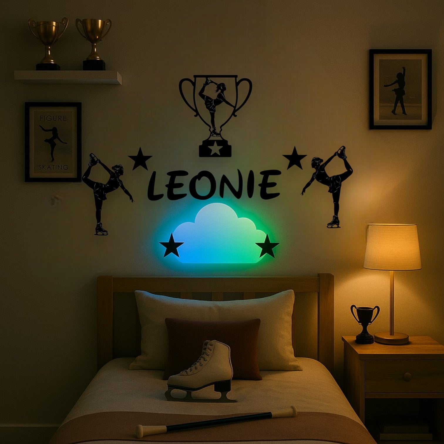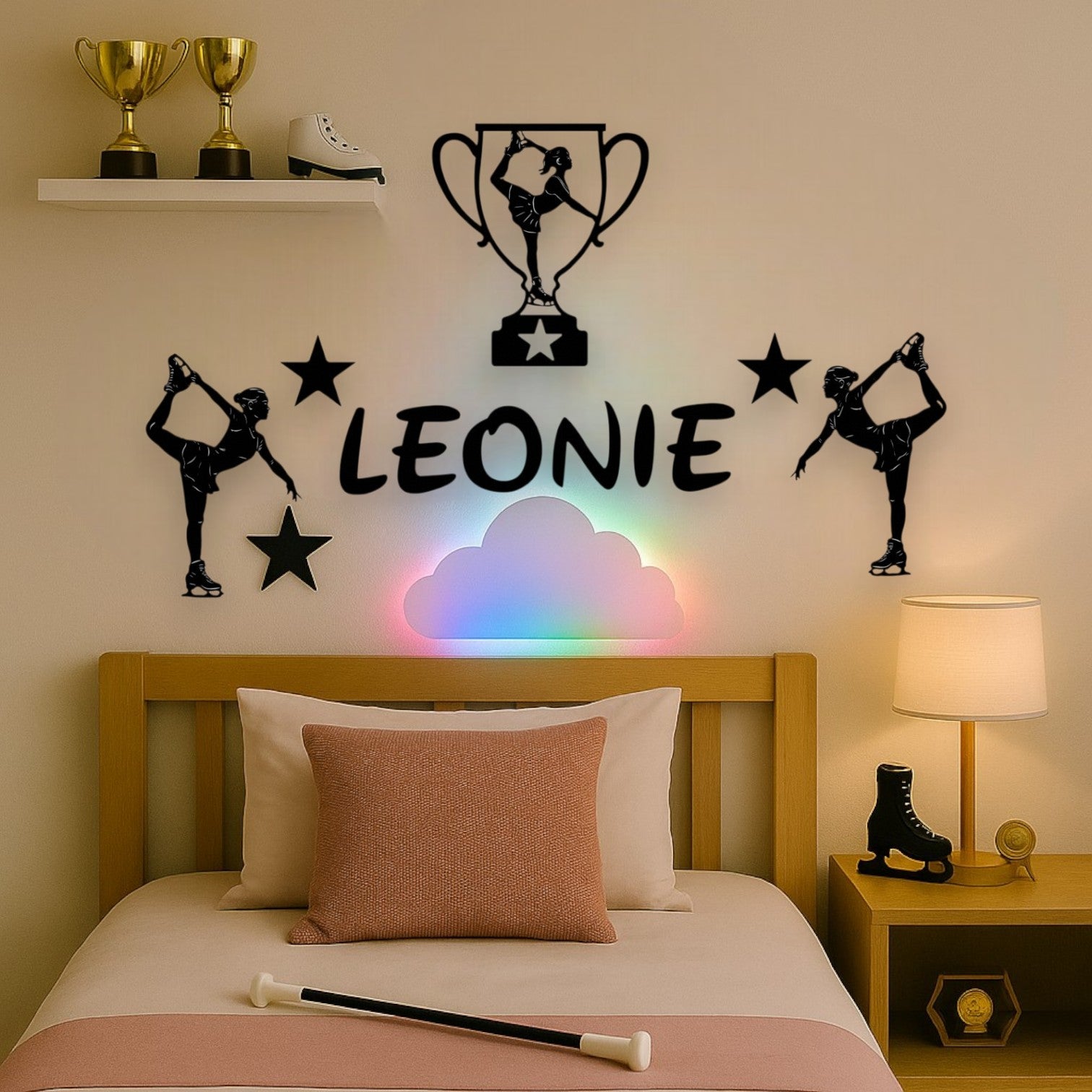 Le prénom est mis en valeur au centre, entouré de deux silhouettes de patineuses en pleine figure, d’un patin stylisé et d’un trophée étoilé. Un design raffiné qui allie grâce, mouvement et inspiration pour une chambre pleine de style et de passion.
