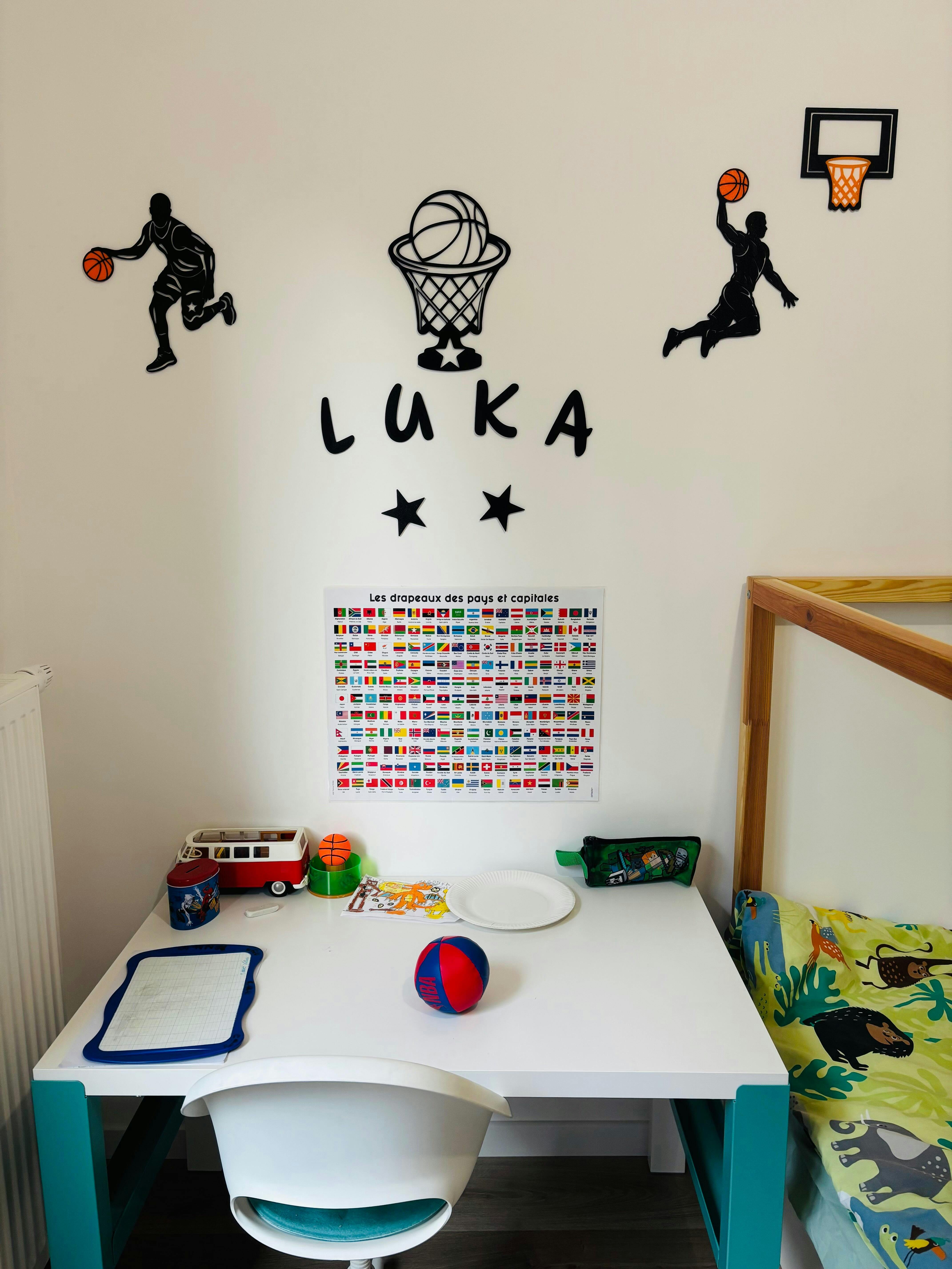 Faites vibrer la chambre de votre enfant avec cette décoration murale basket personnalisée avec prénom, idéale pour les passionnés de basketball.