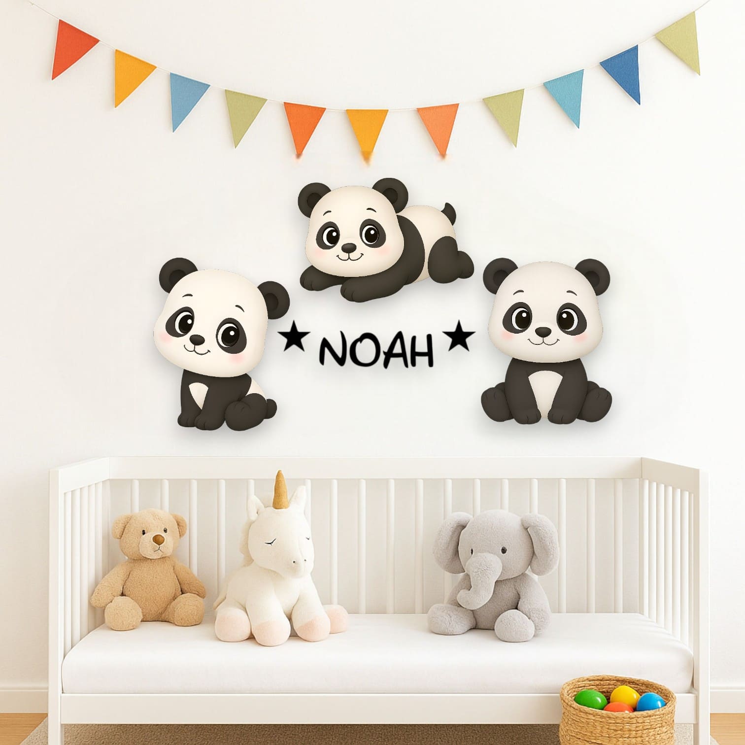 Le prénom de votre enfant est entouré de trois pandas trop mignons, parfaits pour une chambre zen, équilibrée et remplie de tendresse.