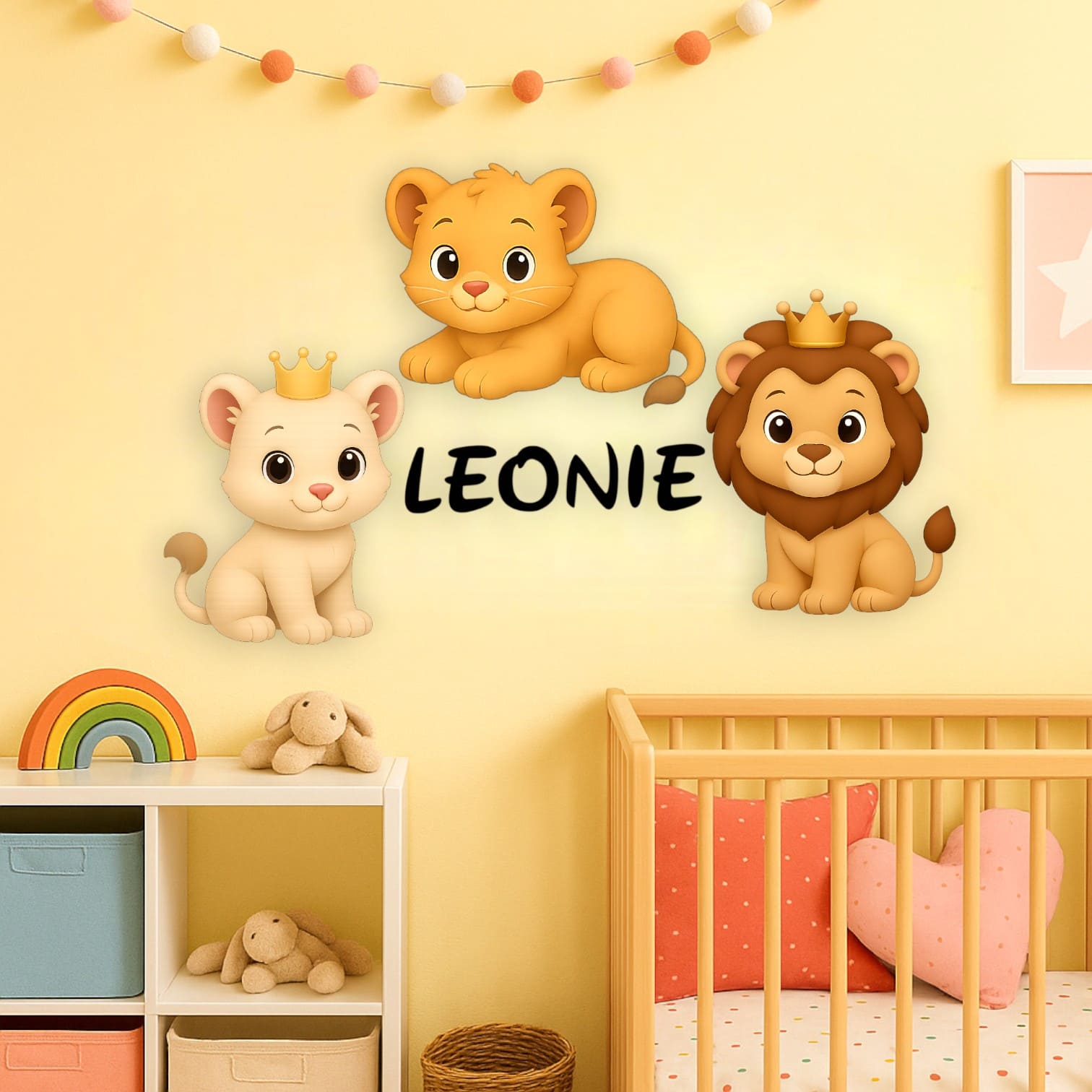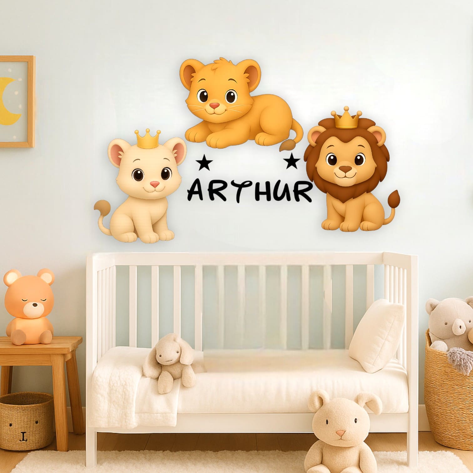 Ce modèle met en valeur le prénom de votre choix, entouré de lions tendres et protecteurs, symboles de courage et de force. Une décoration élégante qui apporte une touche sauvage et rassurante à la chambre.