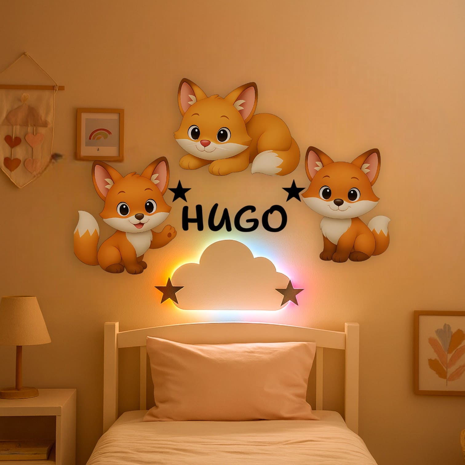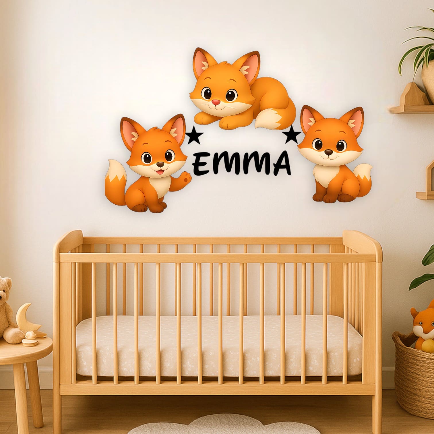 Son prénom est mis en valeur au cœur d’un design élégant, accompagné d’adorables renards qui apportent une touche de douceur et de poésie à l’univers de la chambre.