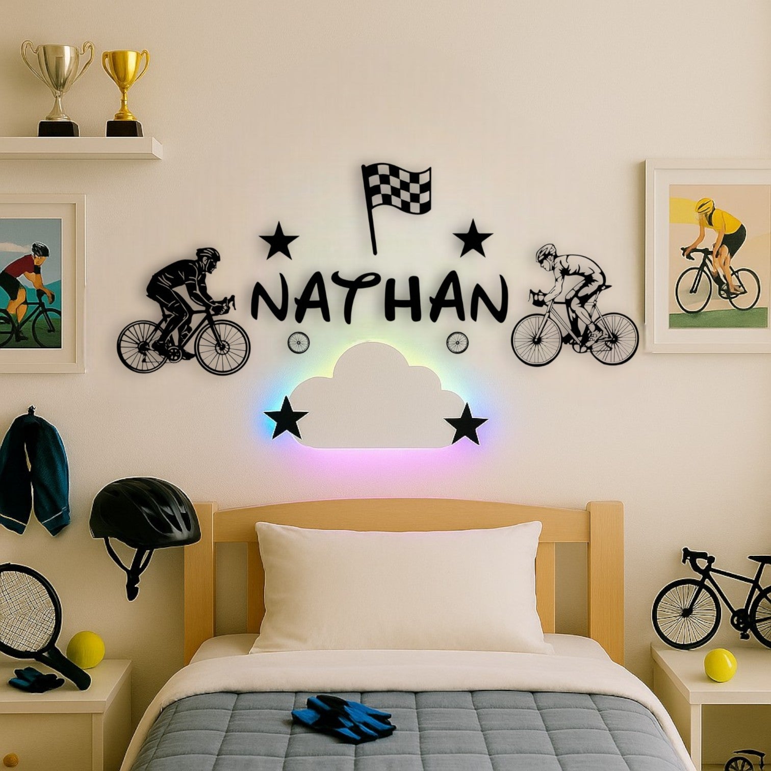 Transforme la chambre de ton enfant en véritable piste cycliste avec cette décoration murale cyclisme personnalisée avec prénom.
