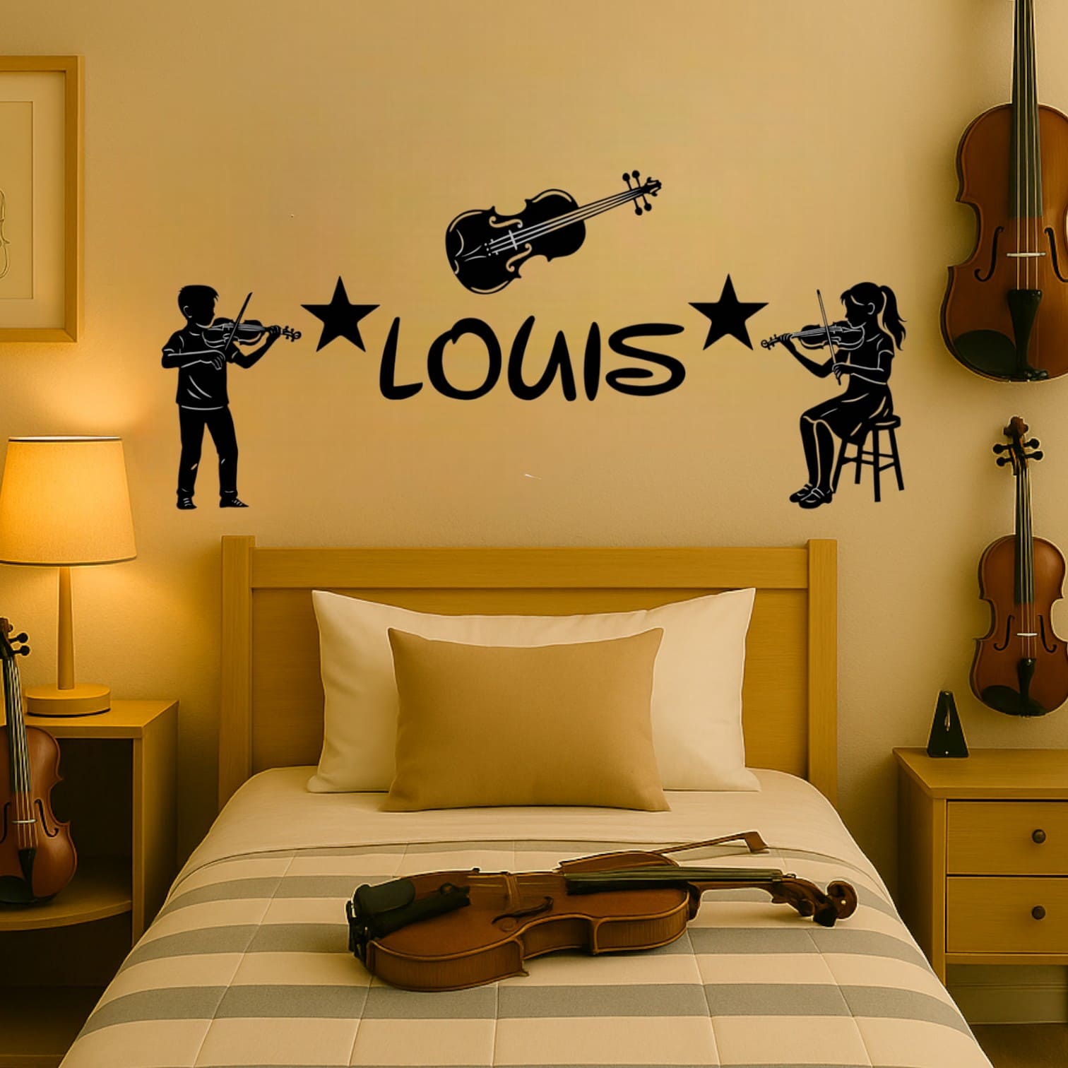Ce modèle met en valeur un garçon et une fille jouant du violon de part et d’autre du prénom choisi, surmontés d’un violon stylisé en motif central.