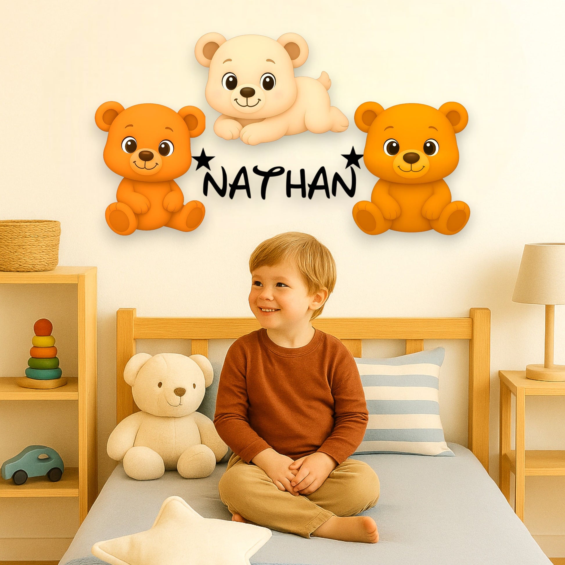 Le prénom est entouré de trois adorables oursons aux formes douces et bienveillantes, pour un univers chaleureux et rassurant.