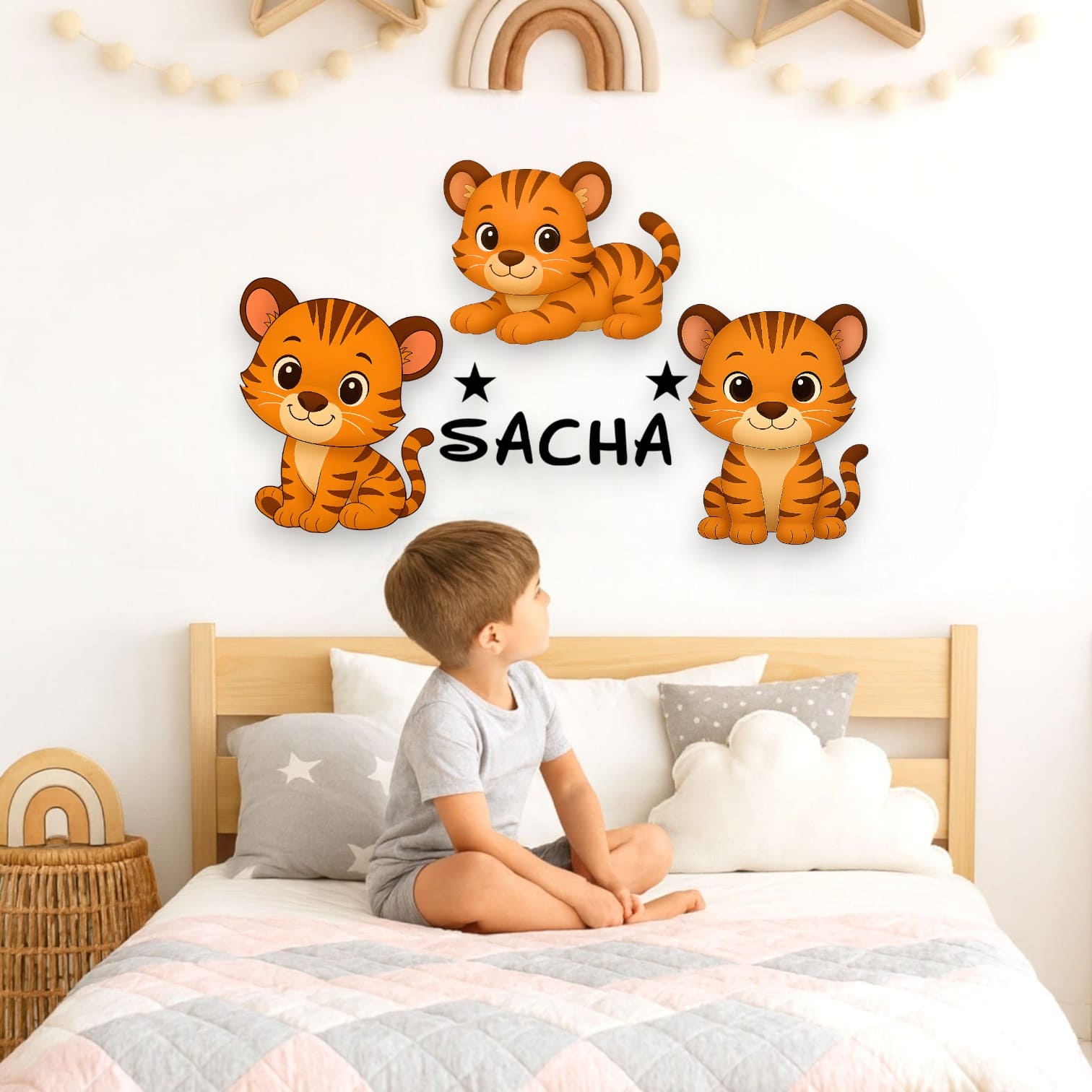 Le prénom est mis en valeur au centre, entouré de trois tigres stylés qui donnent immédiatement du caractère à la pièce.