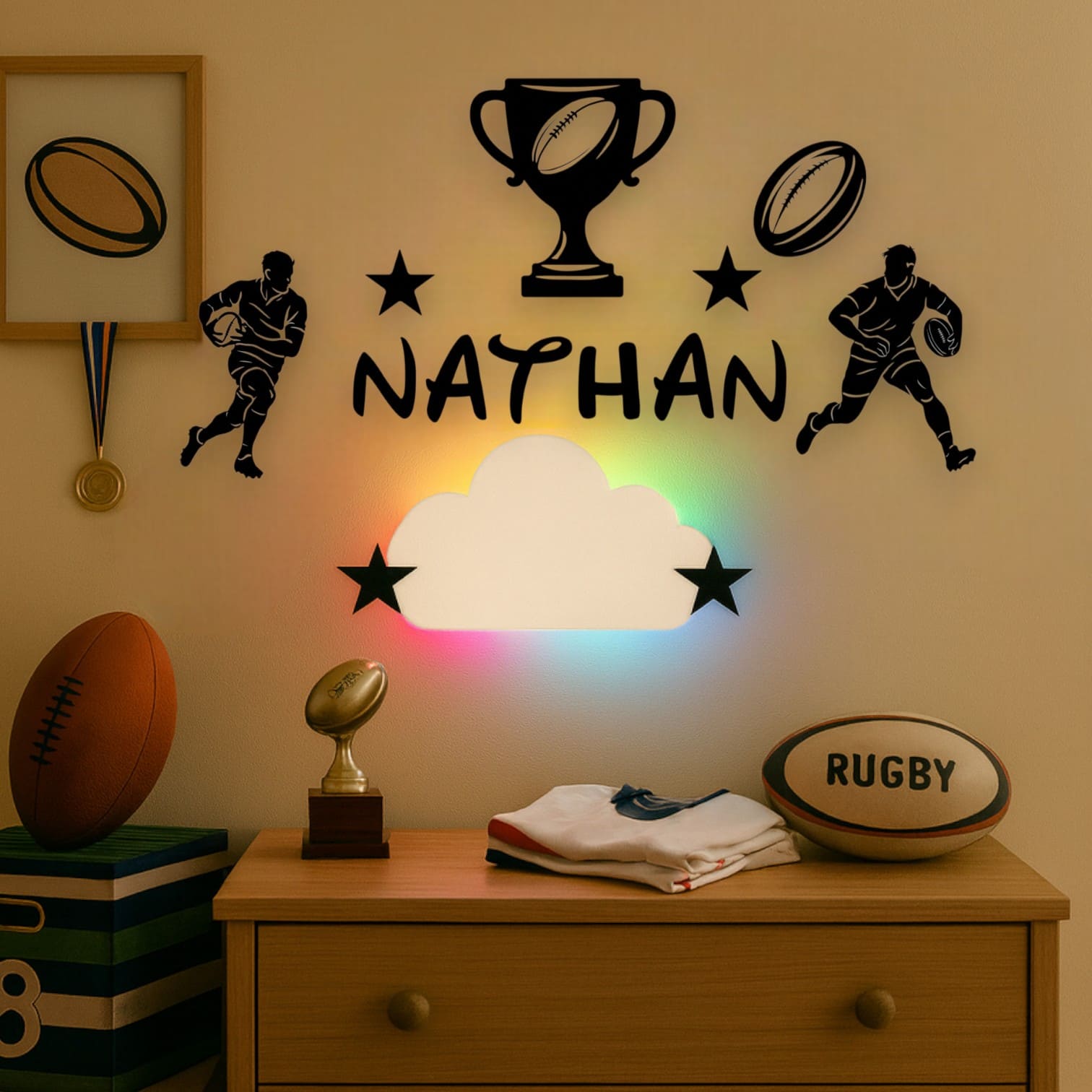 Au centre, son prénom trône fièrement, entouré de deux joueurs en pleine action, d’un ballon de rugby et d’un trophée de champion. Un design énergique qui respire la passion du ballon ovale et transforme sa chambre en véritable terrain de jeu.