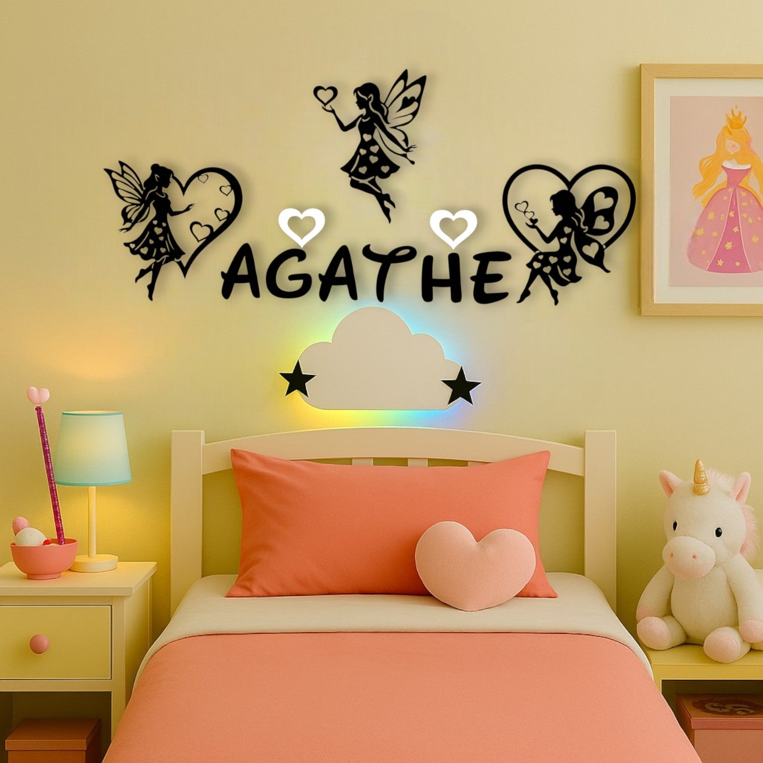 Ajoutez une touche de magie et d’amour à la chambre de votre enfant avec cette magnifique décoration murale personnalisée avec prénom. Trois adorables fées entourées de petits cœurs viennent sublimer le prénom choisi pour créer un univers féerique et unique.
