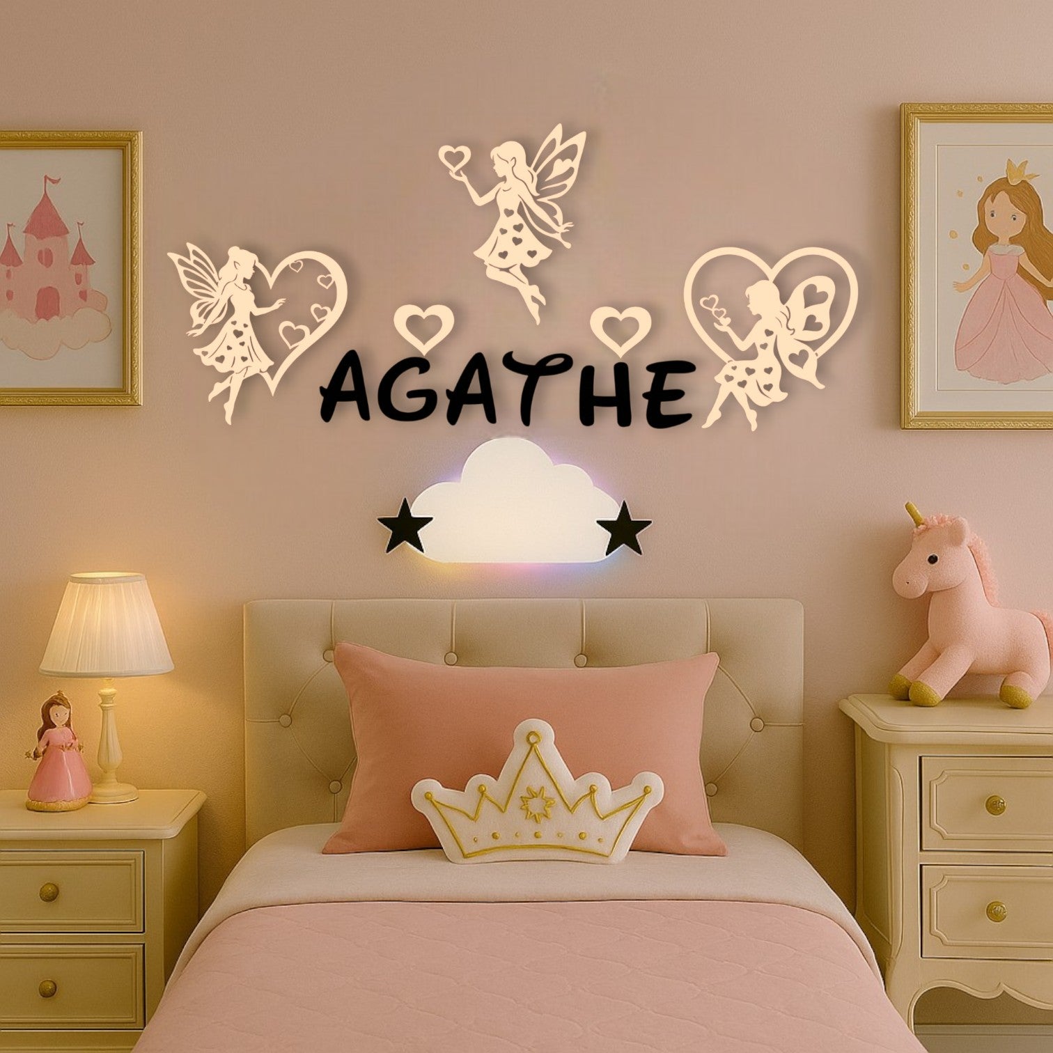 Avec ses trois fées et ses cœurs délicats, cette décoration murale transforme la chambre en un véritable conte de fées.