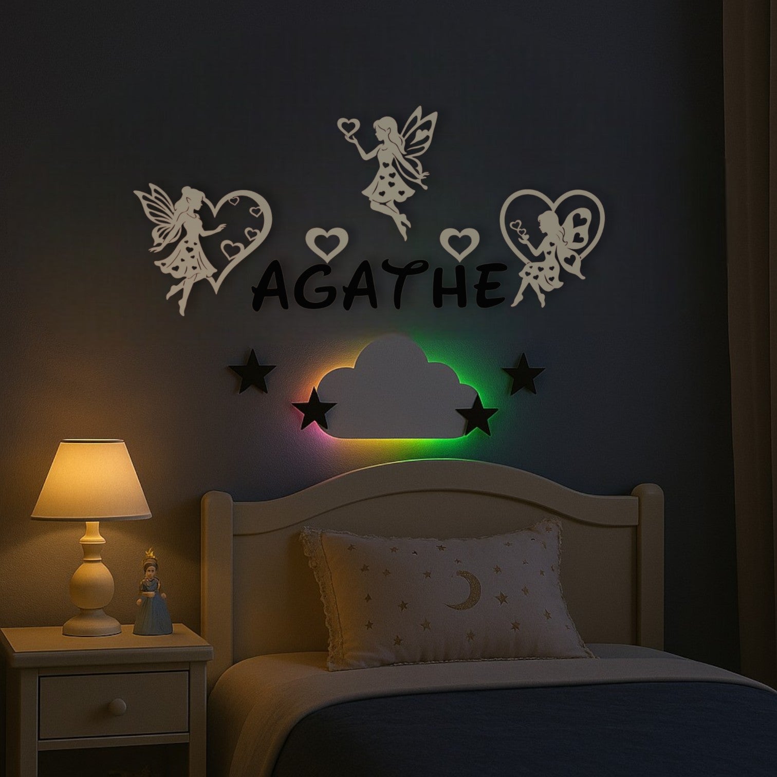 Apportez encore plus de magie grâce à notre nuage lumineux LED RGB placé sous le prénom. Il diffuse un halo coloré et enchanteur qui illumine la chambre et met en valeur la décoration.