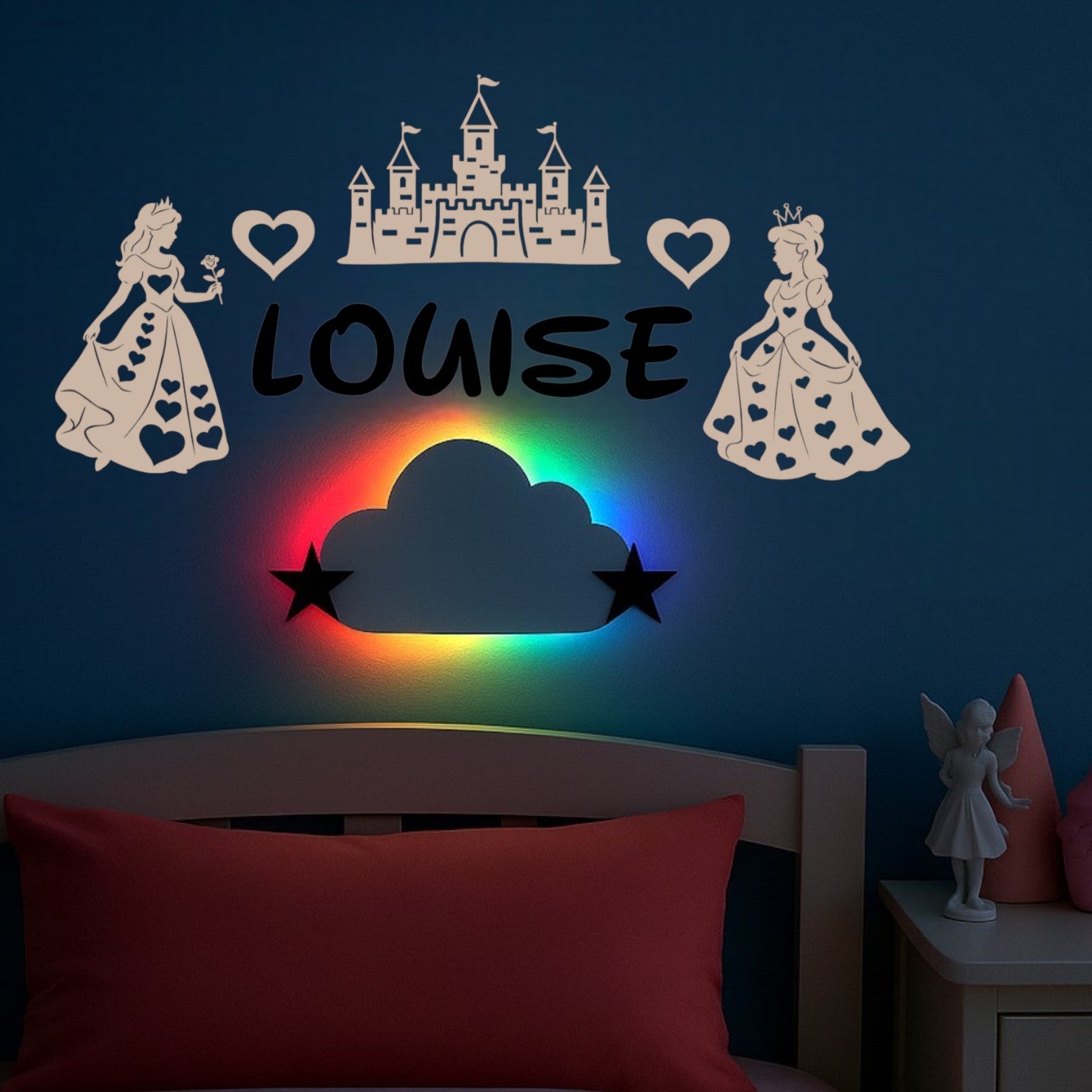 Ajoutez une touche de magie supplémentaire grâce à notre nuage lumineux LED RGB placé sous le prénom. Il diffuse un halo de couleurs douces et féeriques qui sublime la décoration et crée une ambiance chaleureuse dans la chambre.